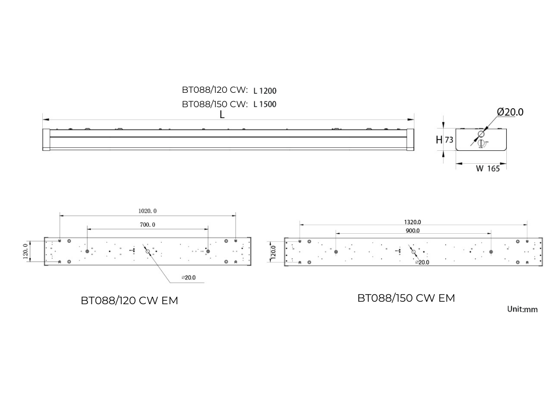 | BT088/120 CW EM | 230V | Max 40W(2.3W)* | Max 3800lm(340lm)* | 4000K | >82 | 60° | 1200 x 165 x 73 mm | White | 4 |
